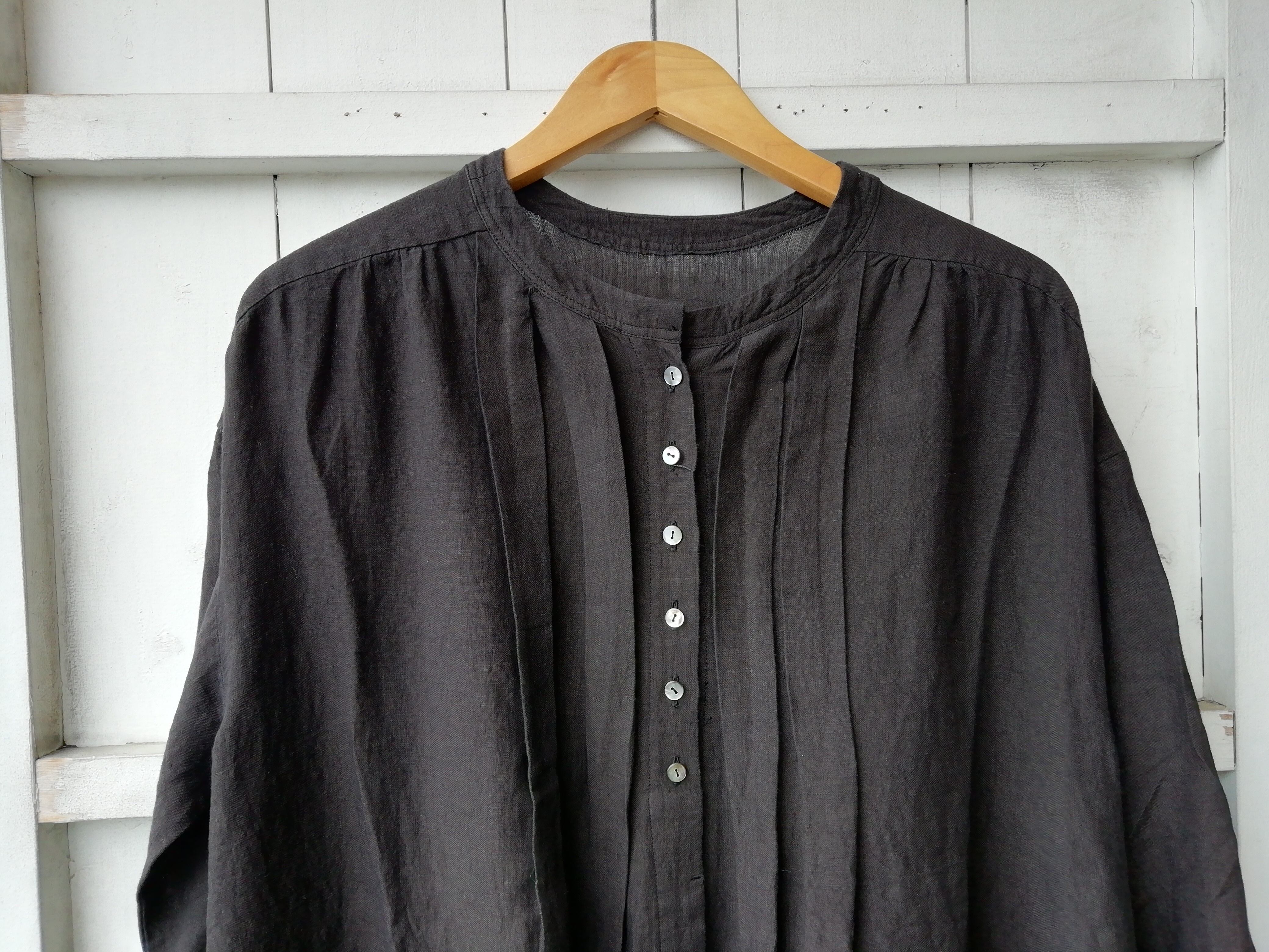 手作業にこだわった60/1の麻素材を使用。長い時間を費やし天日干しすることで独特の表情のある生地感になっています。こちらは前後着用可能な2WAYタイプで、ワンピースとしてはもちろん、羽織としても重宝しそうです。カラーは、ブラックになります。リネン100%。着丈119cm。脇下55cm。身幅67cm。
