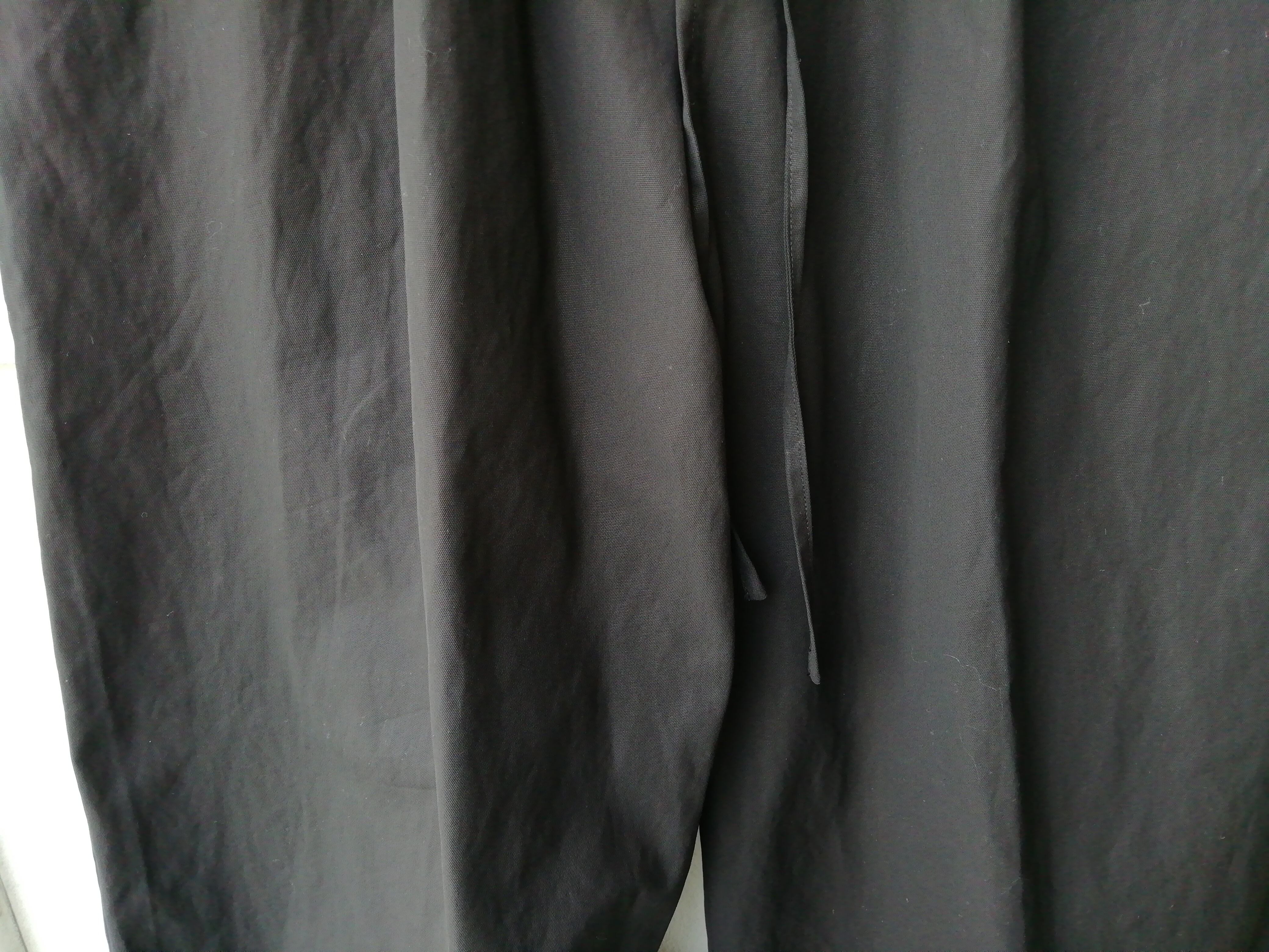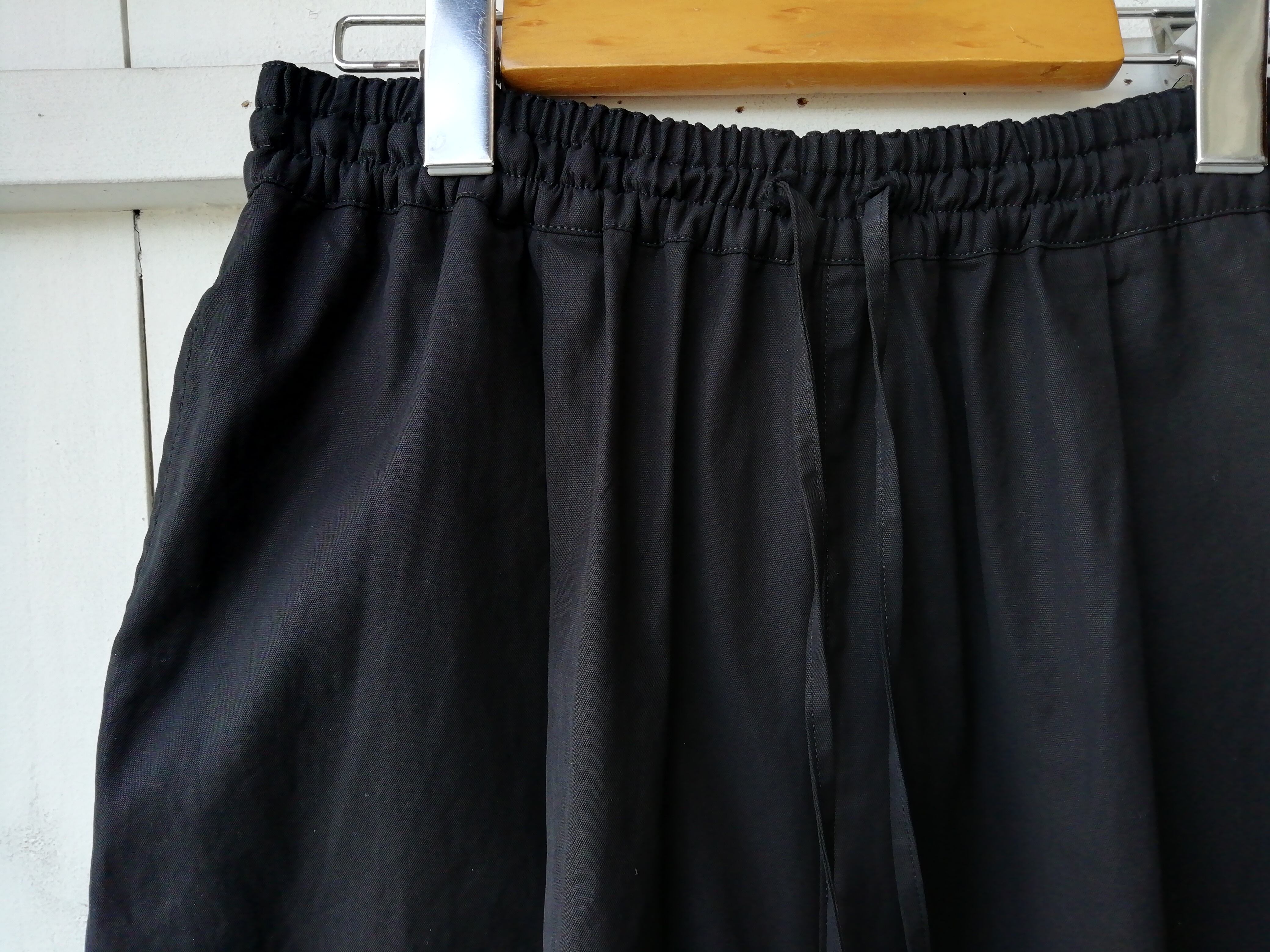 強撚コットンオックス素材に加工を入れ古着のような風合いのパンツ。上質なカジュアル感のあるアイテムに仕上がっています。同素材のジャケットとのセットアップもオススメです。カラーは、ブラックになります。コットン100%。ウエスト(ゴム)68㎝~最大89cm。ヒップ(平置き)56cm。股下60cm。裏地なし。
