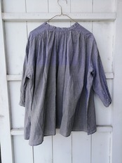 インド南東部のマドラス地方で作られたシワ感のあるナチュラルな風合いの生地を使用したブラウス。軽やかな生地感とたっぷりの身幅で暑い日でも快適に着用していただけます。カラーは、オフホワイト×ブラックになります。コットン100%。着丈63cm。脇下69cm。身幅80cm。MADE IN JAPAN 。