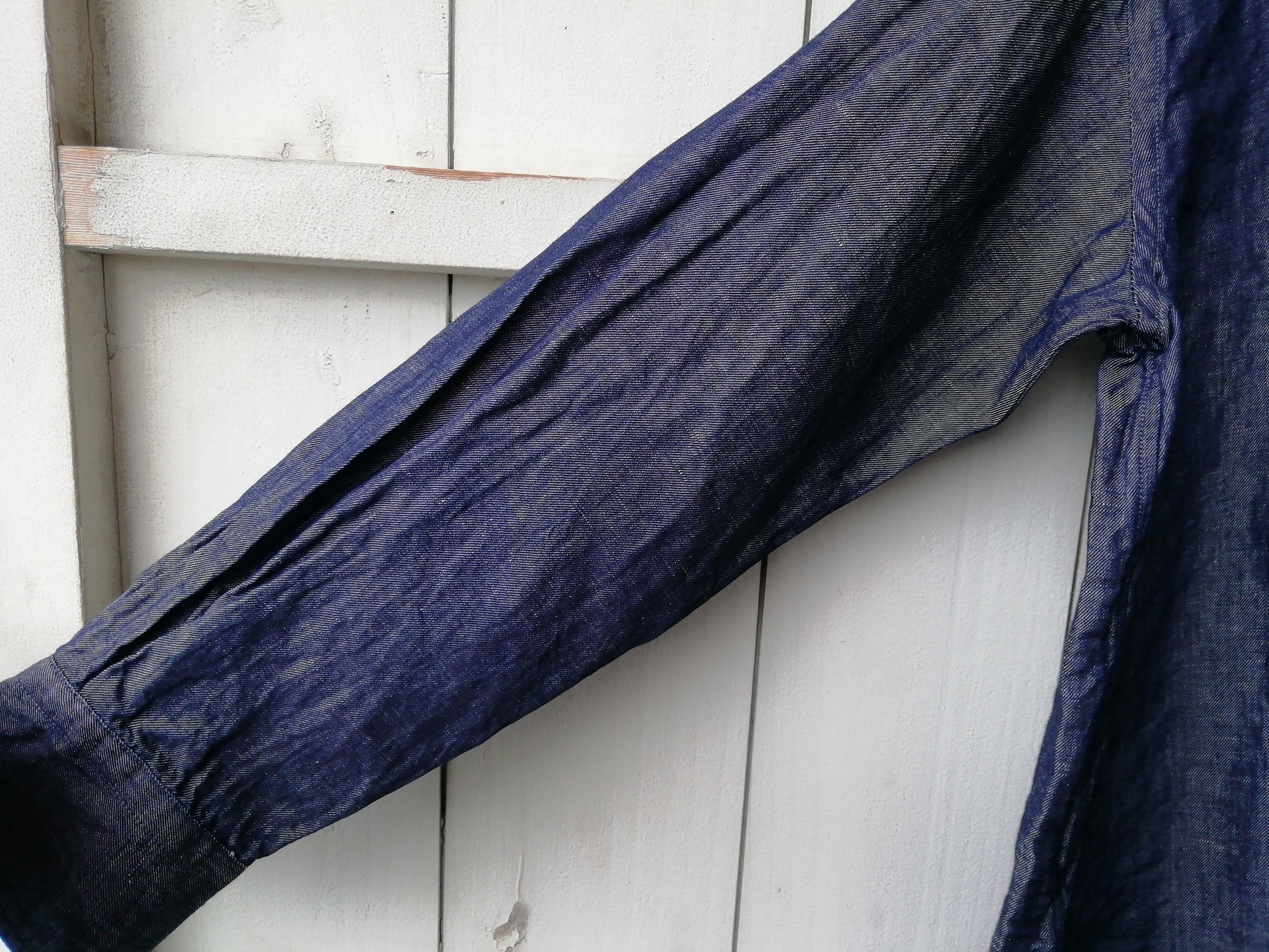 経糸にコットン、緯糸にリネンを使用して織り上げたツイル素材のバンドカラーシャツになります。デニムの産地の岡山で一貫して生産していて、リネンの特徴である上品な光沢とハリ感に、
