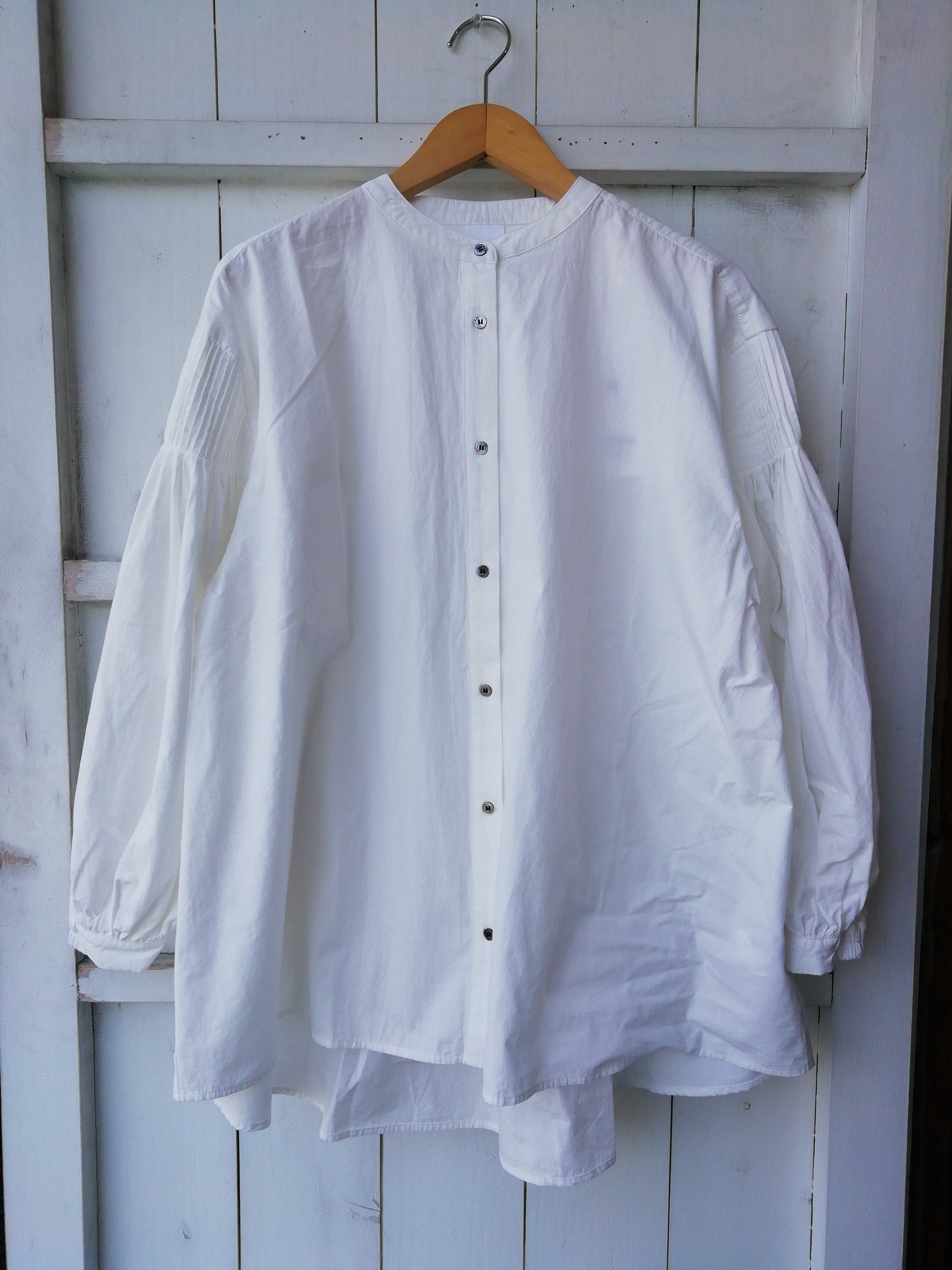 アンティーク調コットンを使用したブラウス。洗いざらしのような風合いでハリコシのある生地感。肩にはピンタックとたっぷりのギャザーを、背面ヨーク下にもギャザーを施し、1枚で様になるアイテムです。前後アシンメトリーでひらりとした裾もポイントに。袖口はゴム入り。カラーは、オフホワイト、ベージュ、ブラックになります。コットン100%。着丈69/77cm。バスト69cm。肩幅43cm。袖丈55cm。