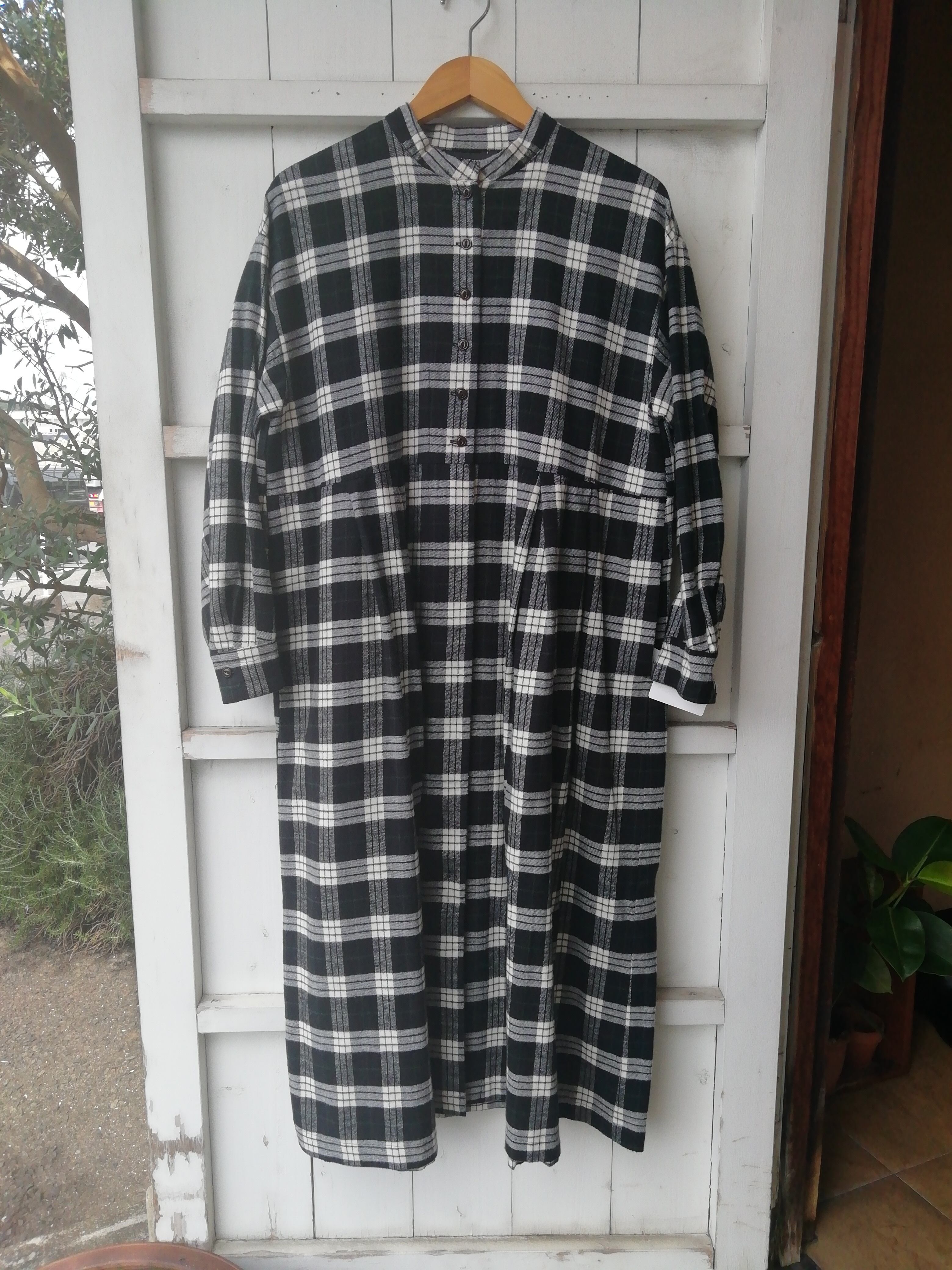 綾織のチェック生地に起毛を施したチュニックワンピース。柔らかく温もりのある風合いでベストなどを合わせたコーディネートも◎。カラーは、ブラックベースになります。コットン100%。