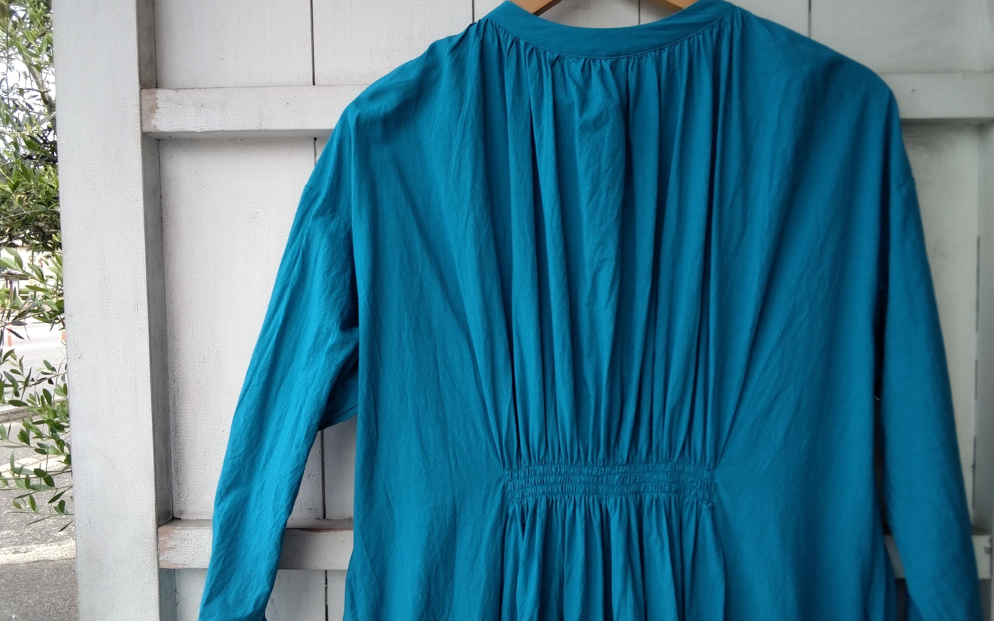 シルクが9%入った綿シルクローン素材のワンピースになります。伊吹山の麓の工場で染色し、天日で乾燥させた素朴なのでやさしく素朴な風合いに仕上がっています。お色がターコイズとグレーになります。