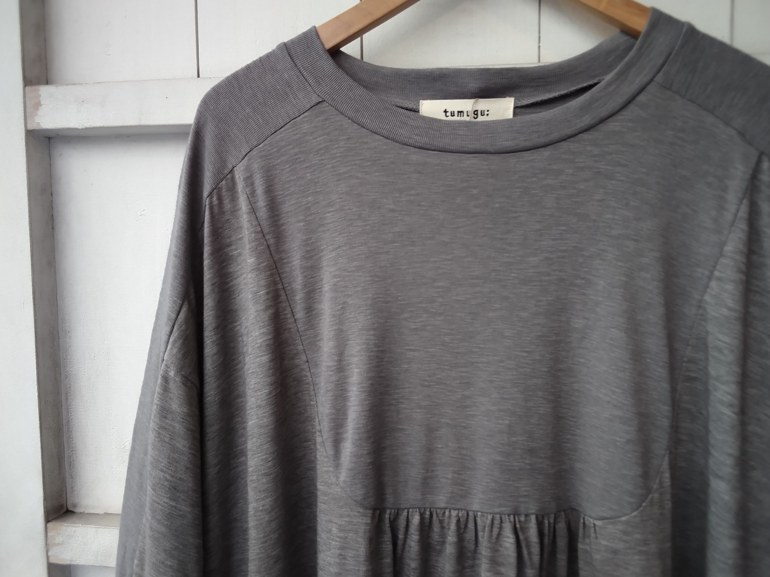 オーガニックコットンのスラブ糸を紡績した、ムラ感とナチュラル感のある柔らかな生地でできたワンピースになります。身幅がたっぷりしているのでゆったりと着ていただけそうです。お色はグレーになります。