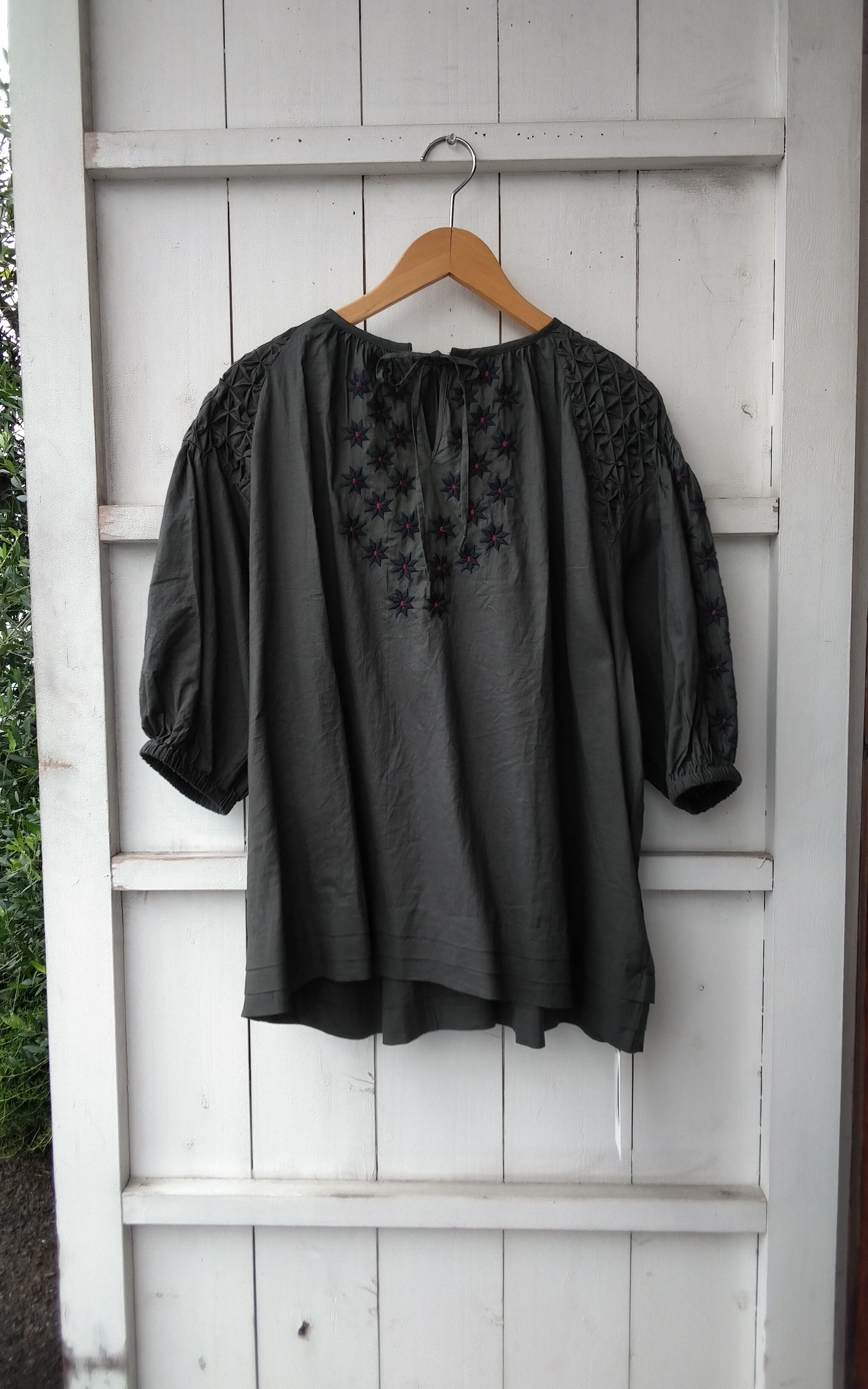 ボリューム袖のインド刺繡ブラウスは、フラワーモチーフ刺繡とスモッキング刺繡を施した特別感のある1枚です。細かく繊細に入る印象的なスカートとのセットアップもオススメです。お色は、ダークグリーンになります。