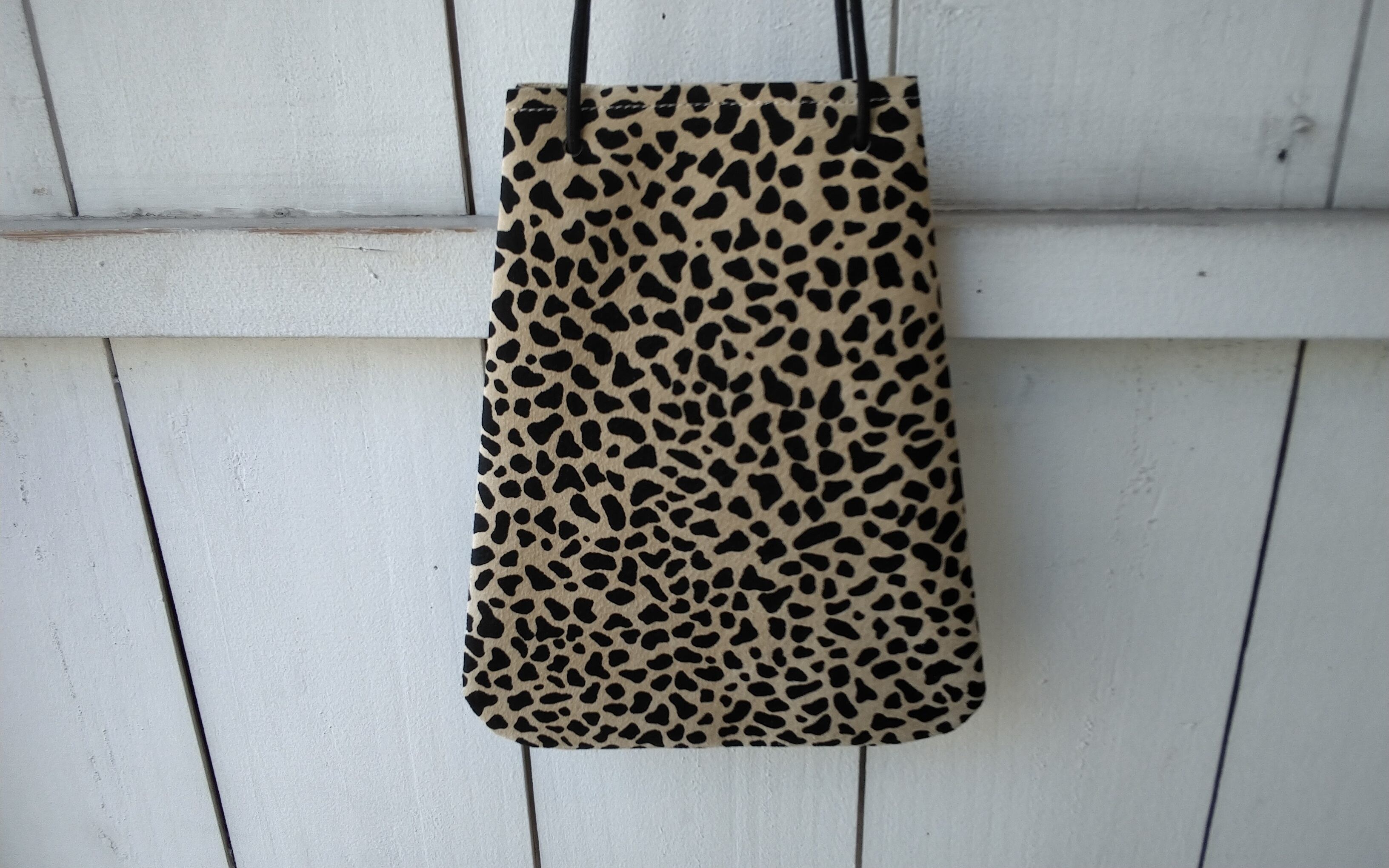 スエード革にプリントを施した良質な素材を使用したバッグ。ひもは、内側でお好きな長さに結んで調節できます。