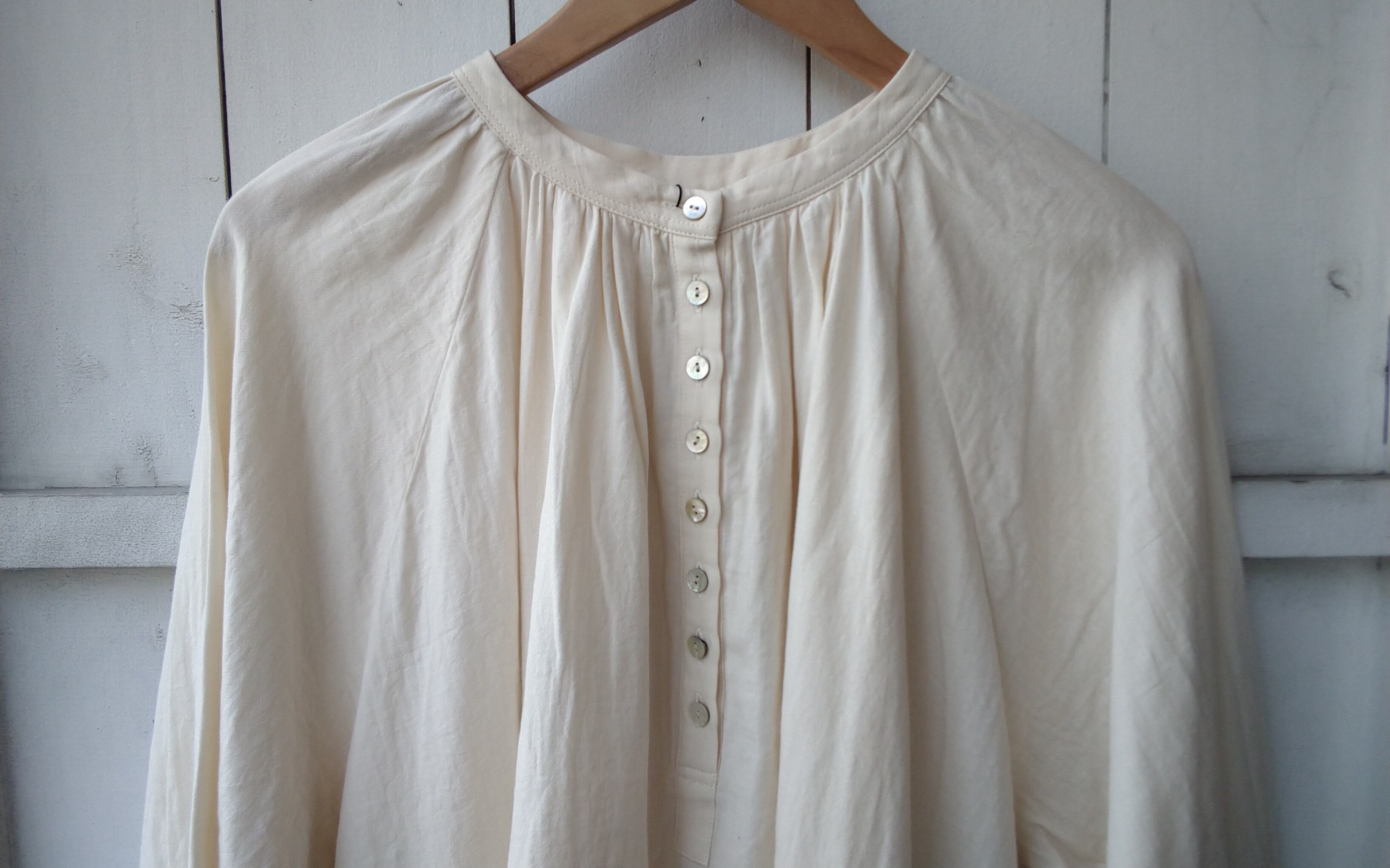 オーガニックコットンの柔らかく優しい肌触りのブラウスです。パフスリーブがふんわりとした印象でゆったりと着用していただけます。お色は、キナリ、ライトグレー、ブラックになります。