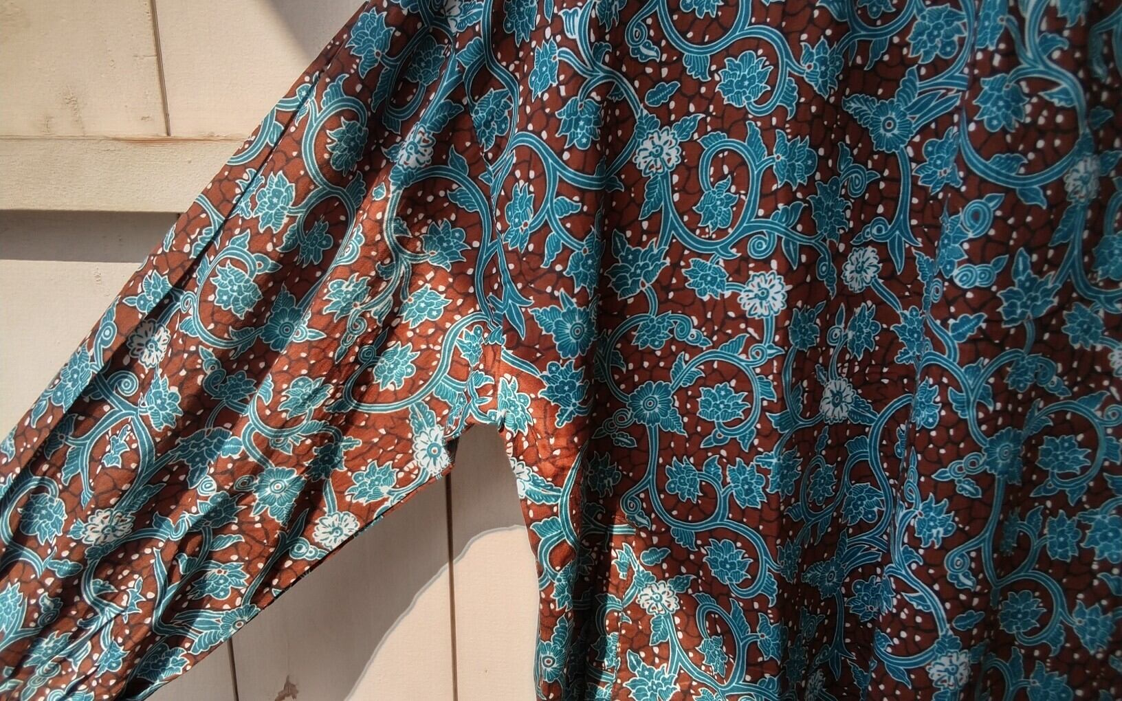落ち感が美しいコットンサテン地に草木モチーフを施したオリエンタルなプリントワンピース。チャイナデテールの前あきデザインが目を惹きます。ガウンのようにカットソーなどの上から軽く羽織るスタイルもオススメです。