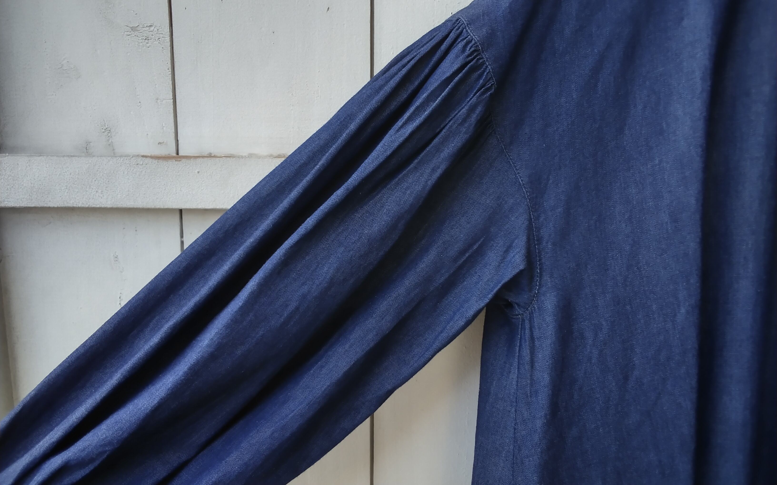 この時期にちょうど良い軽い仕上がりのデニムシャツワンピースです。ふんわり袖で柔らかい雰囲気も◎。羽織としてもオススメです。コットン100%。