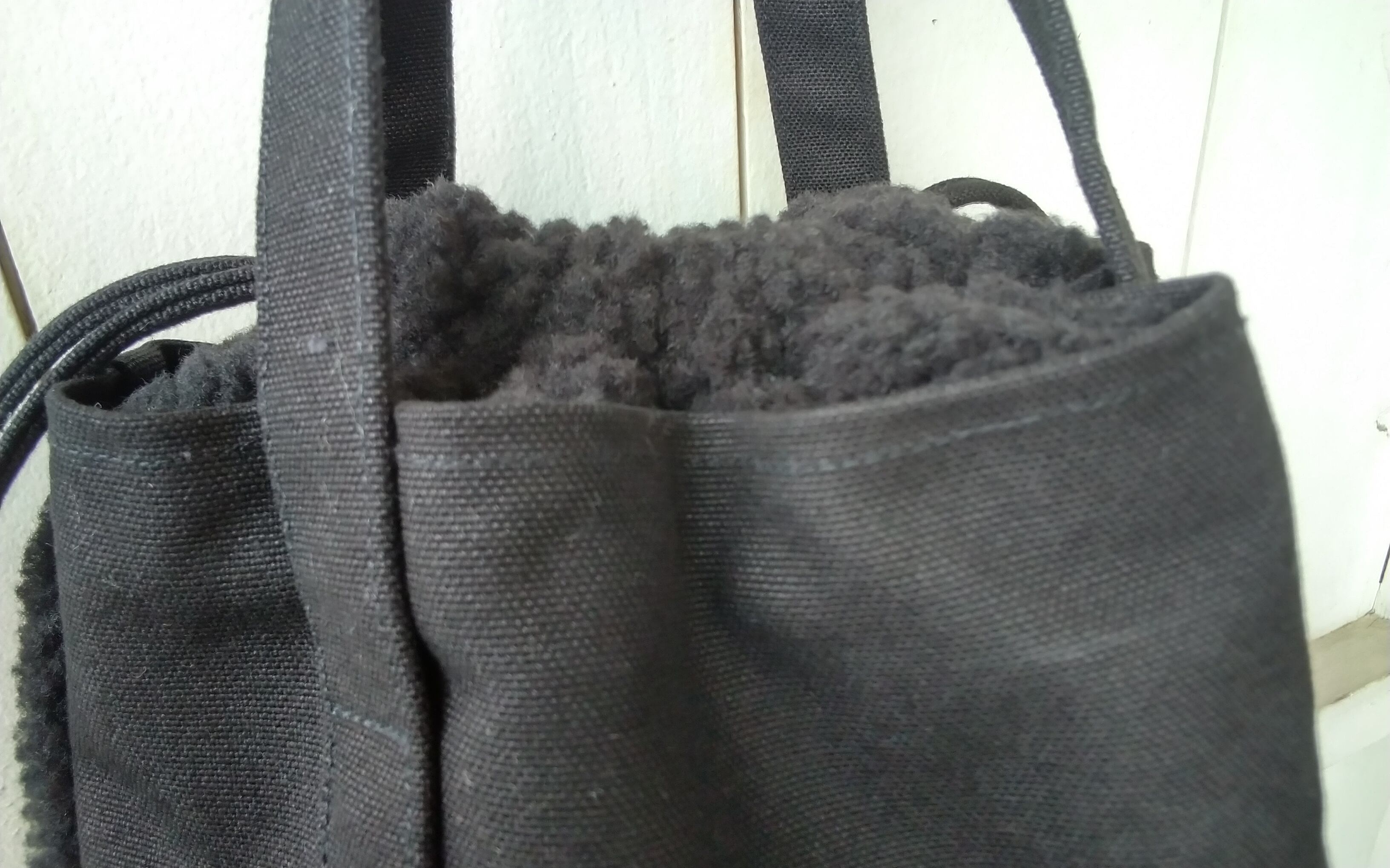 9号帆布とボア素材を使用した巾着バッグ。外ポケットが2つもついているので、スマホや文庫本など、取り出しの多い荷物を入れるのにも便利です。カラーは、ブラックになります。