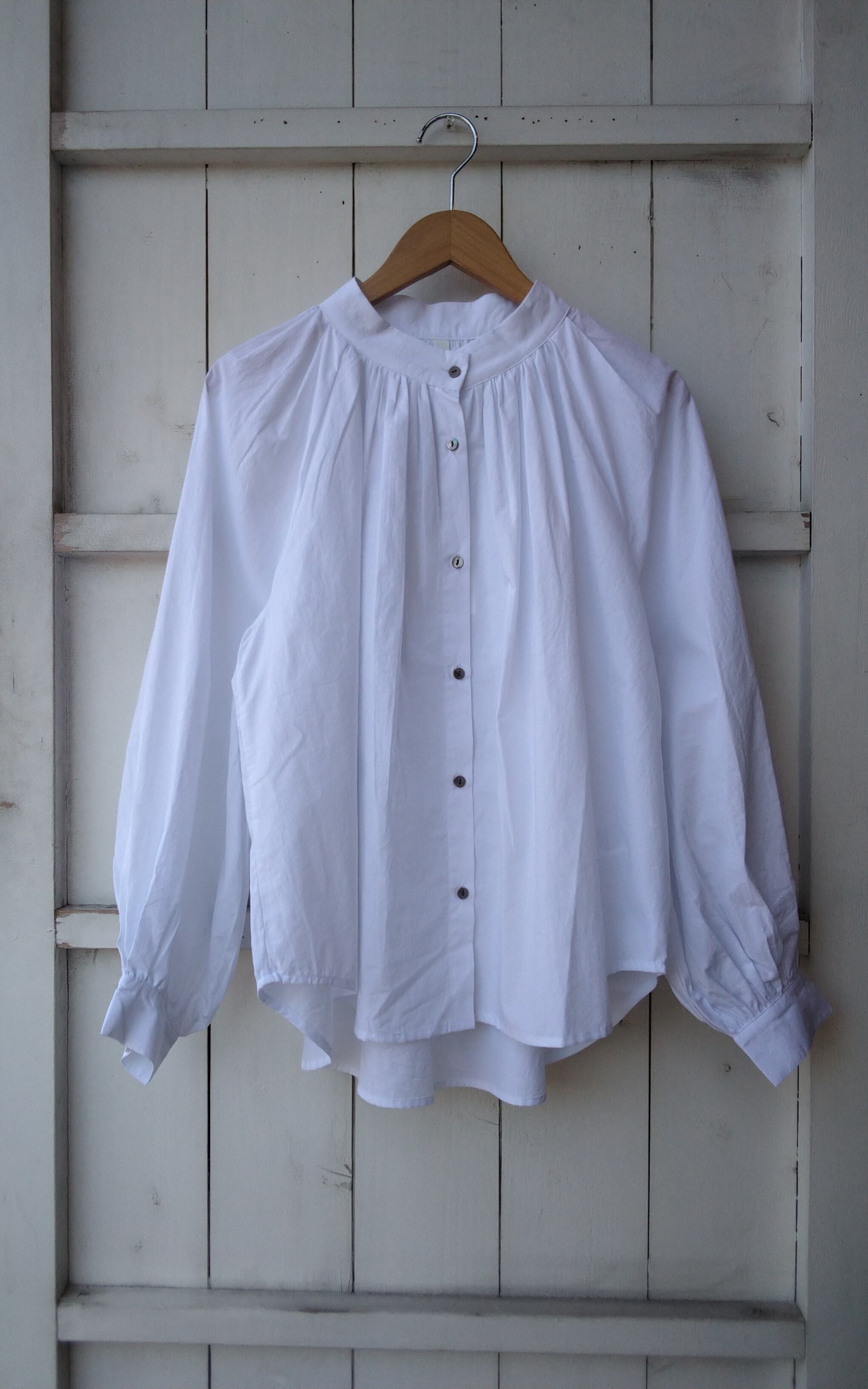 襟元のギャザーとボリューム袖が特徴的なブラウスは、
