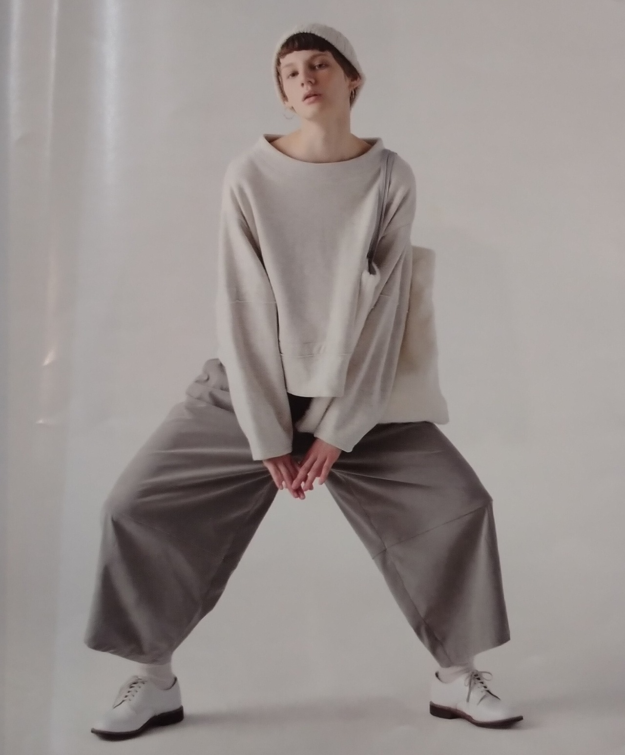 ワイドシルエットの裏起毛ジャージートップス。やや広めの天巾で衿を立ち上げながら。裾の大きく折り返したパーツやタックで作ったビッグスリーブがデザイン性のある1枚に仕上げました。カジュアルに着用ができる素材感ですが、デザイン性のある1枚なのでスタイリングを楽に仕上げてくれます。カラーは、オートミールになります。コットン100%。