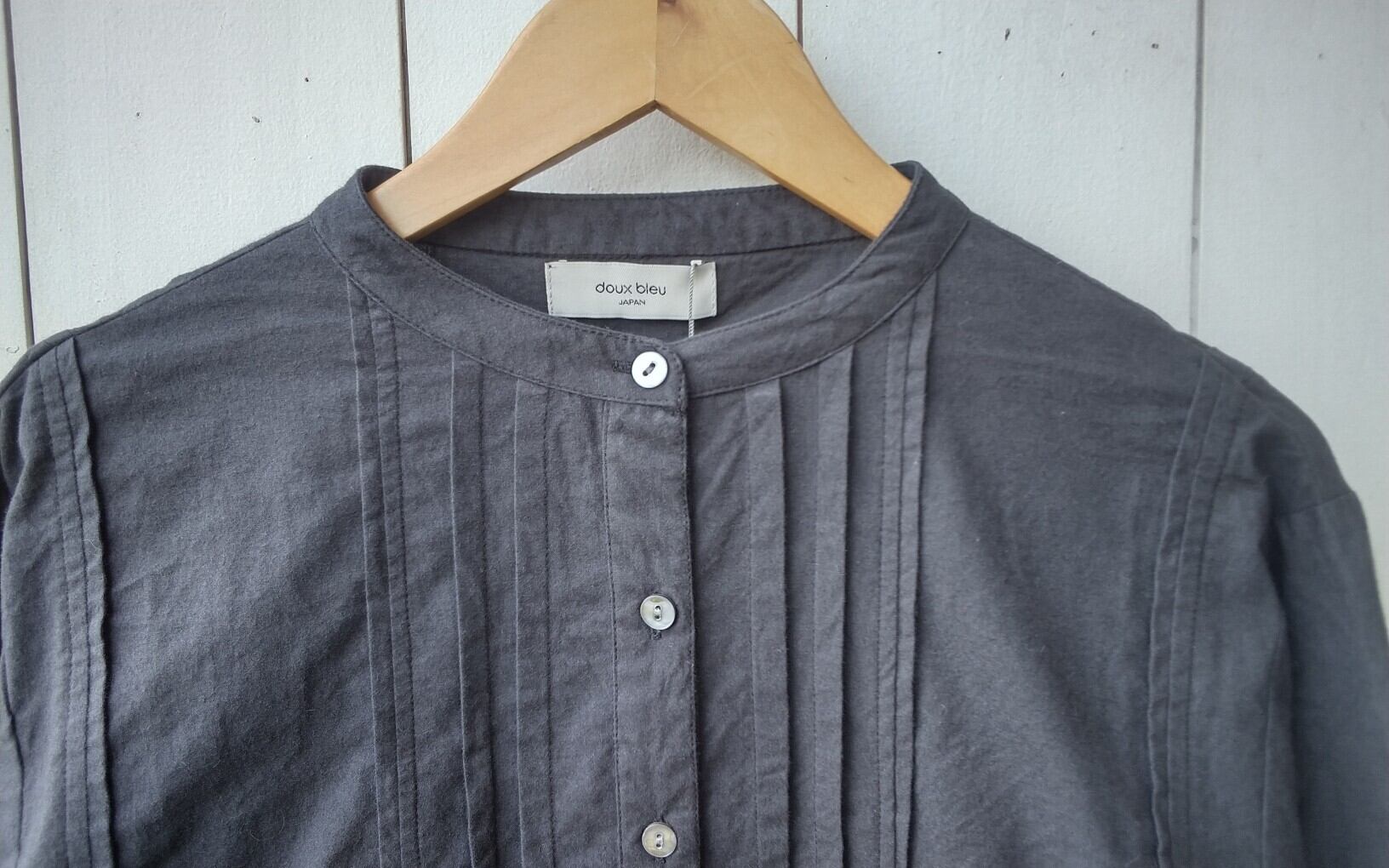 クリーンな印象のバンドカラー、細やかなピンタックとギャザーが生み出すふんわりとしたフォルムやボリュームのあるスリーブでフェミニンさを感じさせる仕上がり。スリムパンツにはもちろん、ワイドなボトムスと合わせて、こなれ感のある着こなしもオススメです。カラーは、ブラックになります。コットン100%。