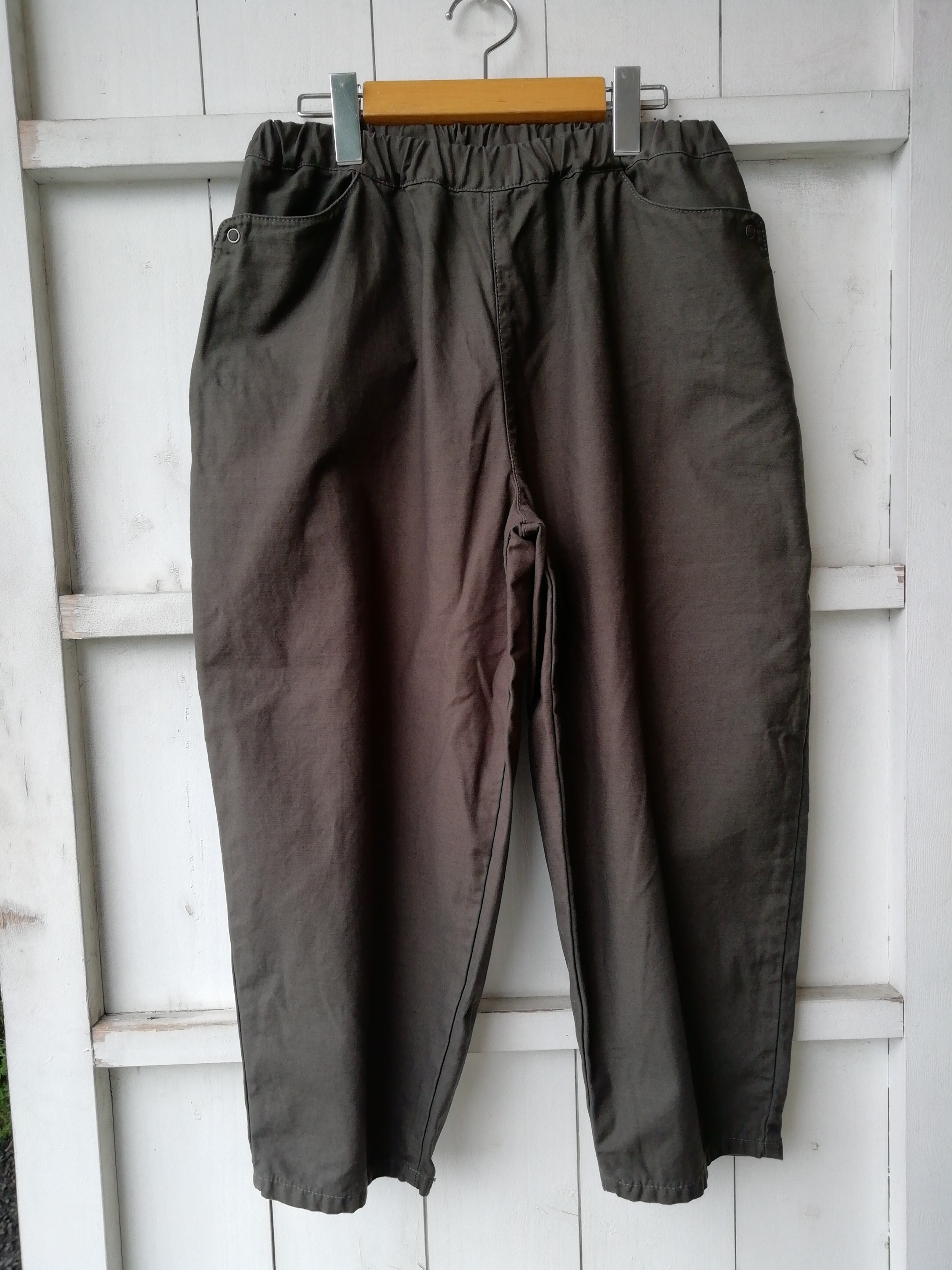 ハリのある丈夫なバックサテン素材に製品染めをしているため、乾いた表情や優れた肌触り質感が特徴。ウエスト周りがゴムになっていて紐で結べます。丈は8分丈程、太もも周りはかなり太めで、足首にかけてテーパードに。ポケット部分的に搭載されたベルスナップ釦のデザインもオススメのポイント◎。カラーは、アイボリー、カーキ×グレージュ、インディゴになります。コットン100%。sizeフリー。