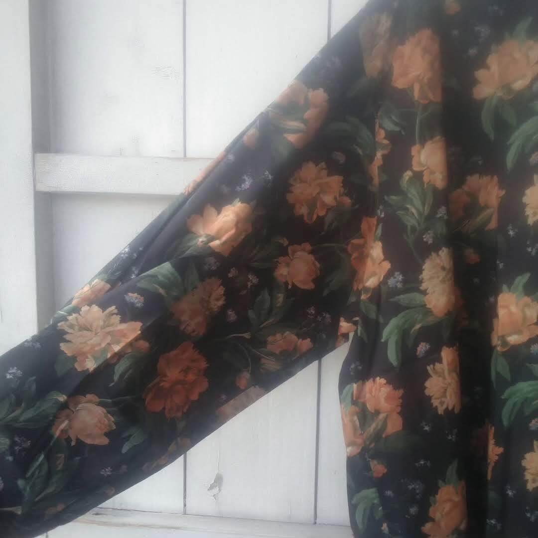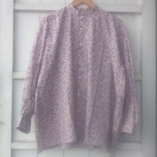 人気のファームスシャツの袖にタックを入れたデザイン。裾に向かって広がりのあるシルエット。ピンクはアイボリー地に、ピンク、紫、緑の小花柄。ブラックは大輪の牡丹やバラ、わすれな草柄。コットン100%。