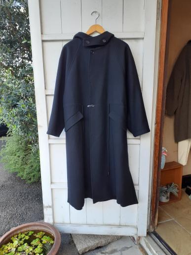 ミリタリーコートから発想を得たデザインのフードコート。衿のスリットデザインが、ボタンを開けたときと閉めたときで異なる表情を見せてくれます。身幅も袖もゆったりとしているので、厚手のニットなどの上からも楽に着ていただけます。カラーは、グレーとブラックになります。ウール100%。