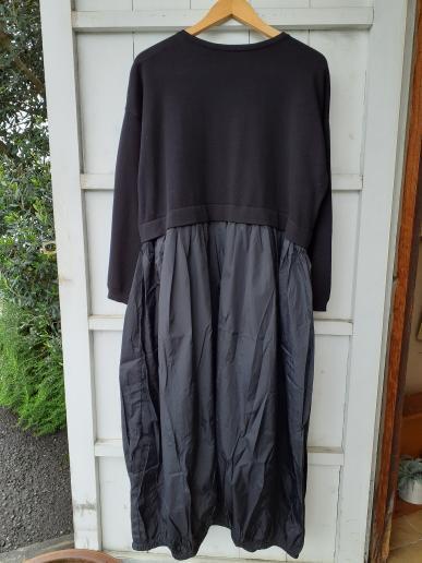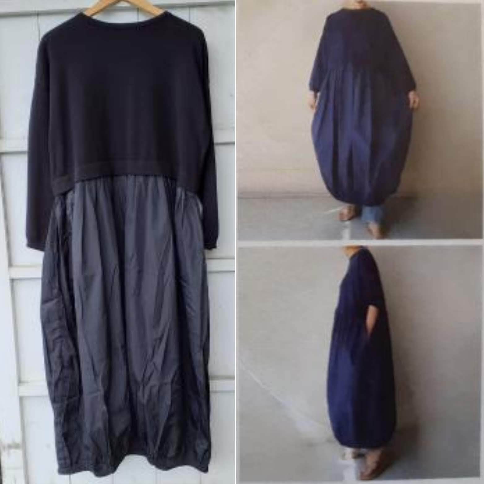 洗い晒したようなシボ感があるシャカシャカ生地と、柔らかな風合いのコットンニットを切り替えたバルーンワンピース。ボリュームのあるシルエットながらも、コンパクトなお袖、身頃とスカートの切り替え位置を上目にすることですっきり見えする1枚に。カラーは、ブラックになります。ニット部分/コットン100%。布帛部分/ナイロン100%。フリーサイズ。