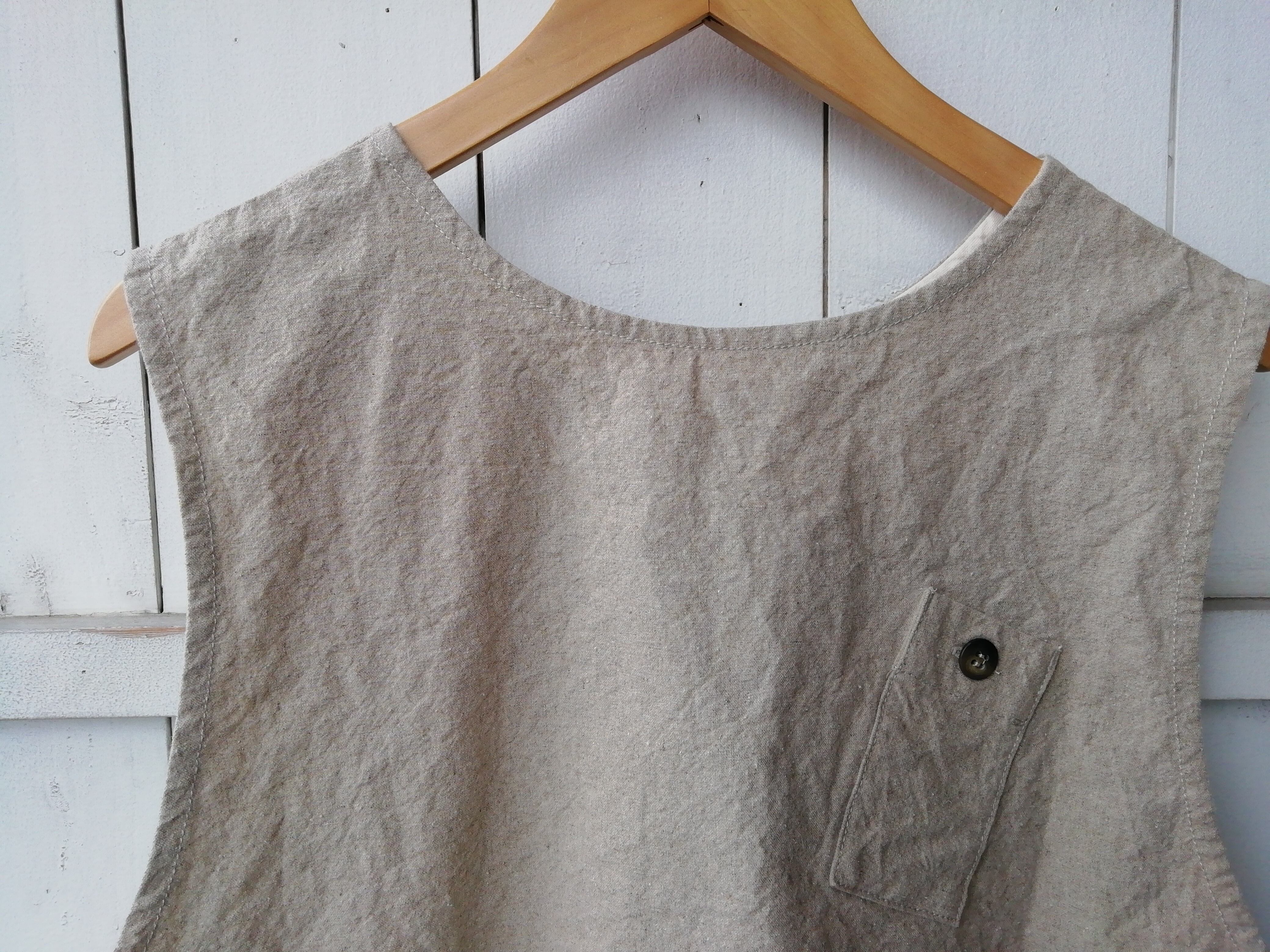 しわ感のあるワッシャー加工を施したリネンコットン素材の2wayべスト。エイジングしたようなヴィンテージライクな表面感が特徴。小さなポケットがある面とアシンメトリーの面の2つの表情を楽しめます◎。Tシャツやシャツ、ワンピースなどとのコーディネートも◎。カラーは、キナリになります。リネン55%、コットン45%。フリーサイズ。総丈58cm、身幅57cm。MADE IN JAPAN 。