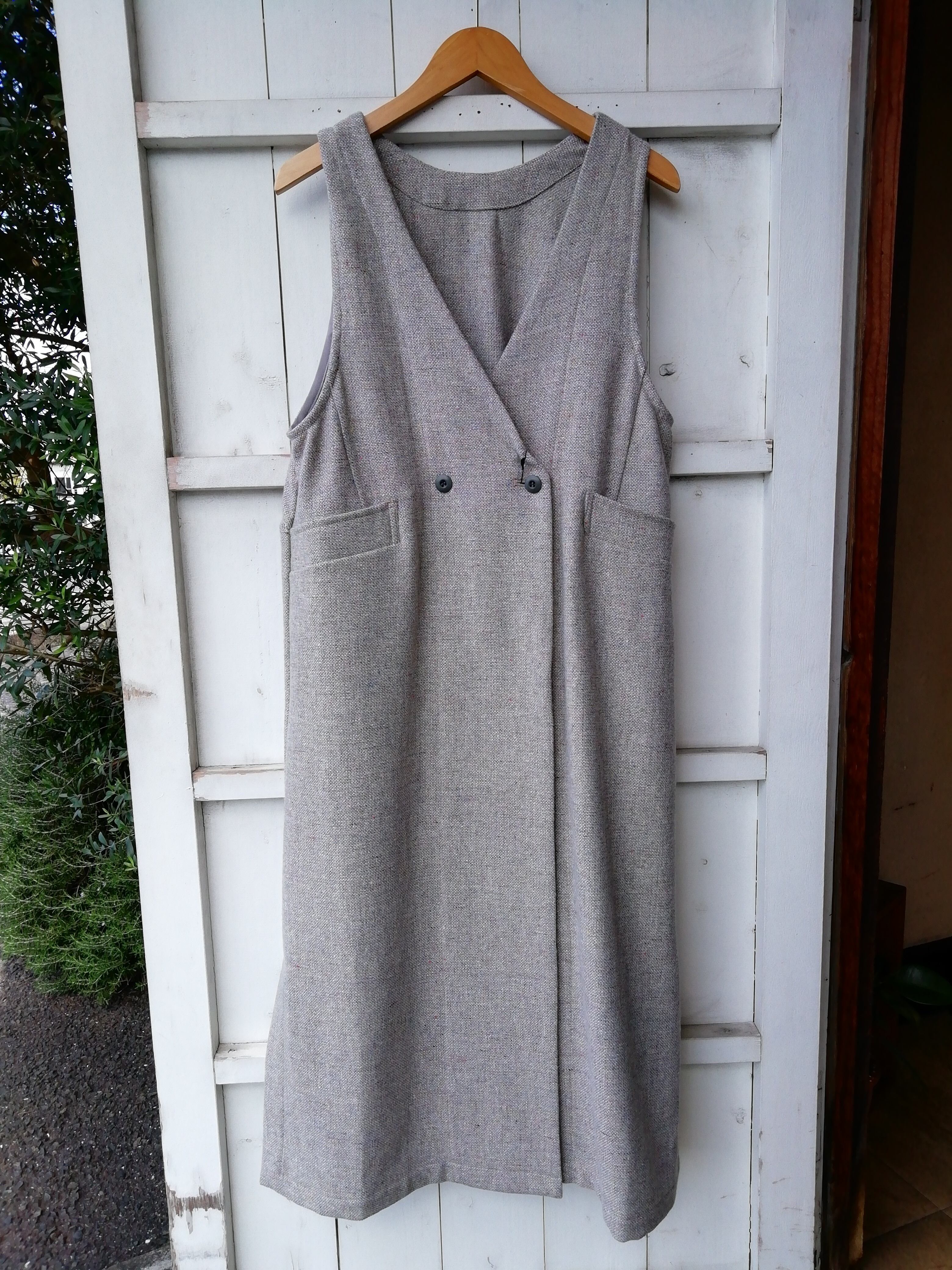 ホームスパンツイル素材のジャンパースカート。前後着用可能な2WAYタイプになっております。カラーは、ライトグレーベースになります。ウール37%、アクリル20%、ポリエステル23%、コットン15%、ナイロン5%。MADE IN JAPAN 。