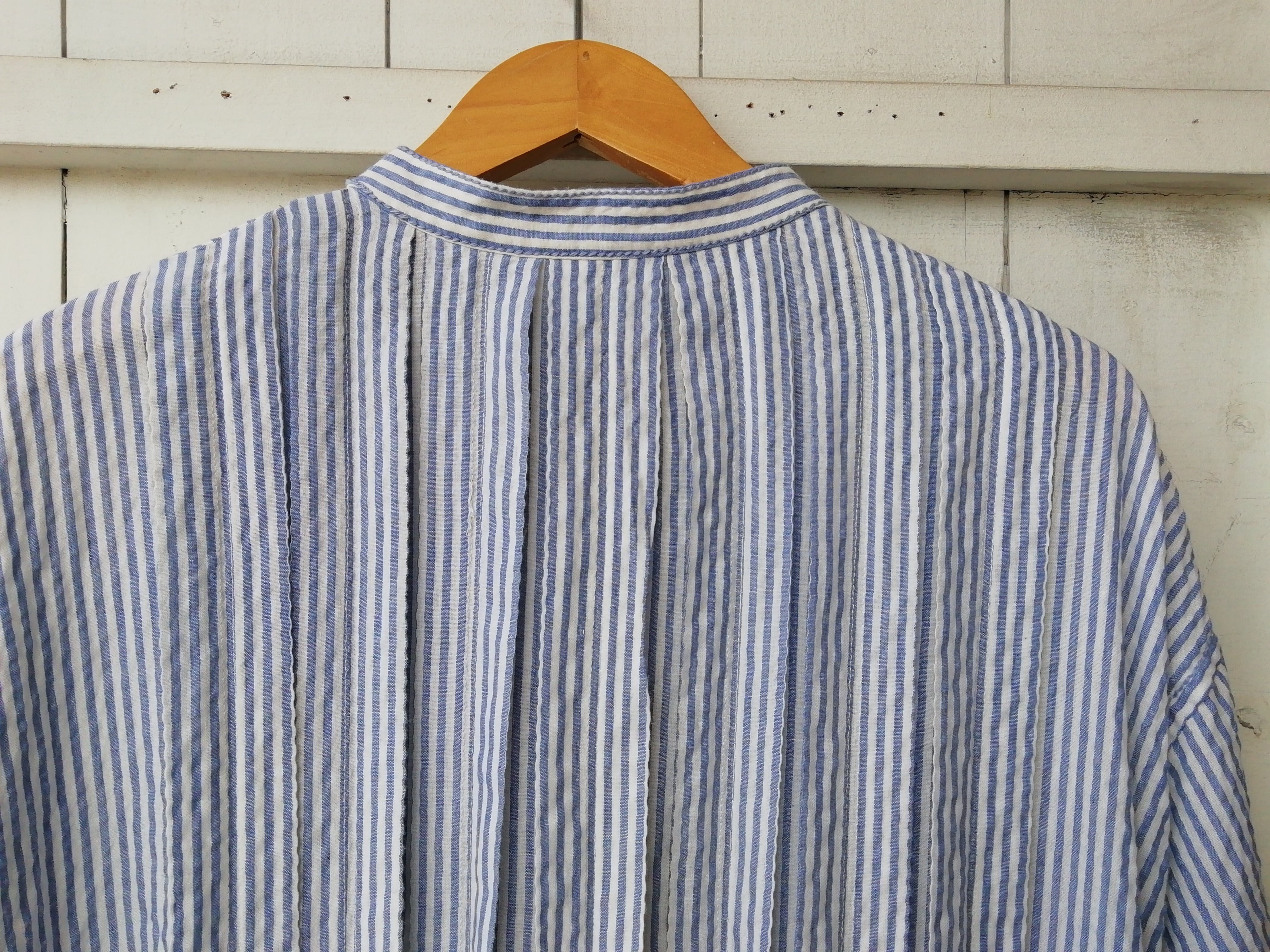 柔らかい薄手の先染めストライプワンピース。表面に凹凸感があり肌あたりも優しい生地でできています。春はカラーパンツを合わせたりするのもいいですね。カラーはブルー(ストライプ)になります。コットン90%、レーヨン10%。